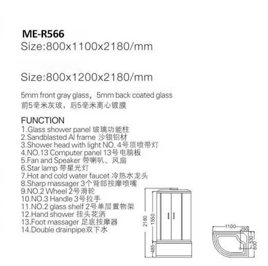 Dush tagligi | 1.Qurilish boshi 2.Star yorug'ligi 3.Fan 4.Speaker 5.Touchscreen boshqaruv paneli 6.Blue tishi 7.fafet 8.Galss shelf 9.Zang va dush 10. Buxoriy tizimi 11. Massajni mashq qiling 12.Body massajchisi 13-raqamli televidenie 14.Radio 15.LI yorug'lik 16.Seat Yostiqsimon Boshqalar ..... |